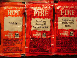 ... Taco bell sauce packets. On our road trip home from Chicago last weekend, Jen, Brooke and I stopped at a taco bell for lunch. While we were waiting for our food we took turns showing each other sauce packets and cracking up. It was the perfect pick-up we needed after several hours of boring driving through rural Wisconsin. Thanks Taco Bell!
